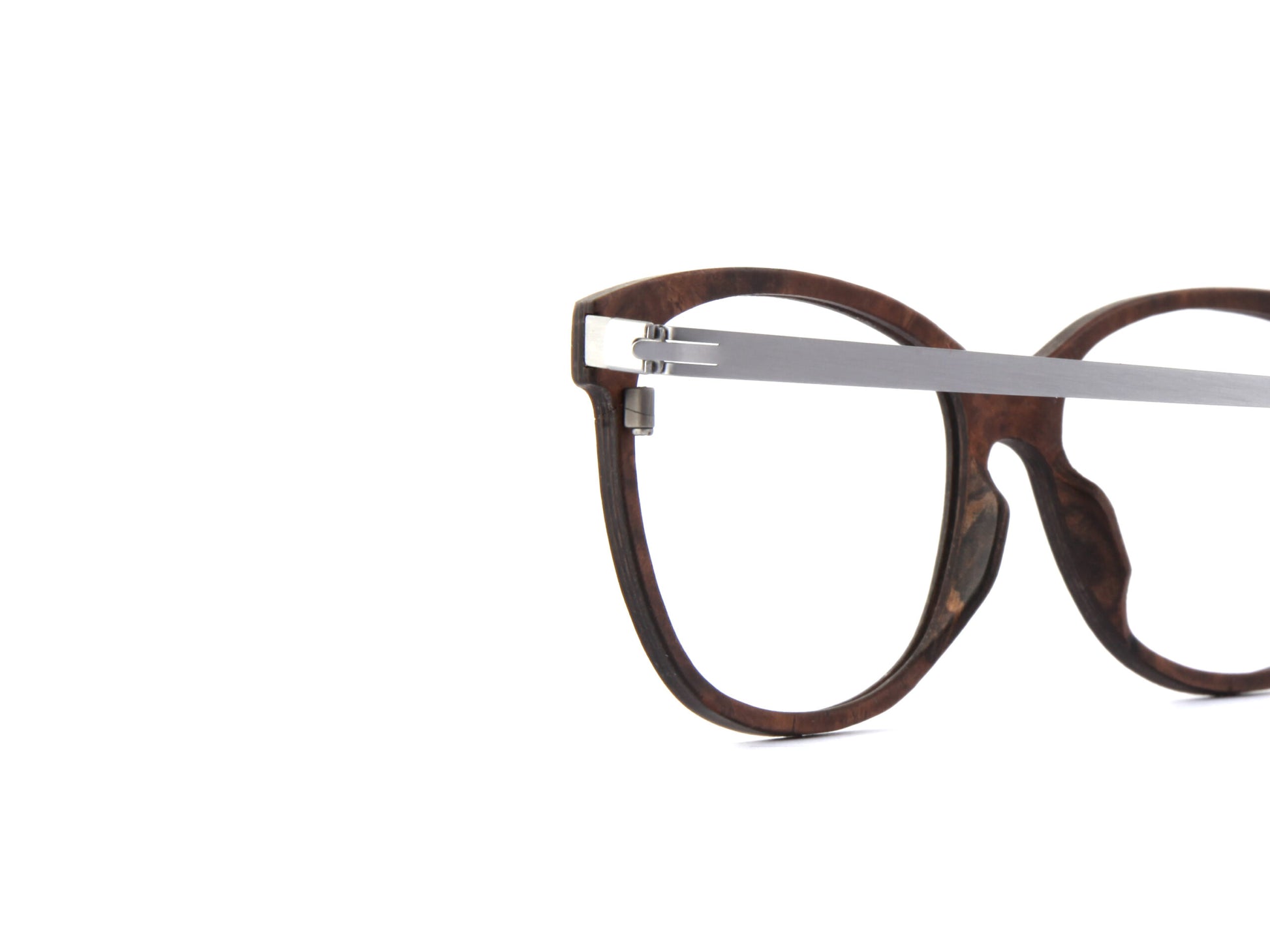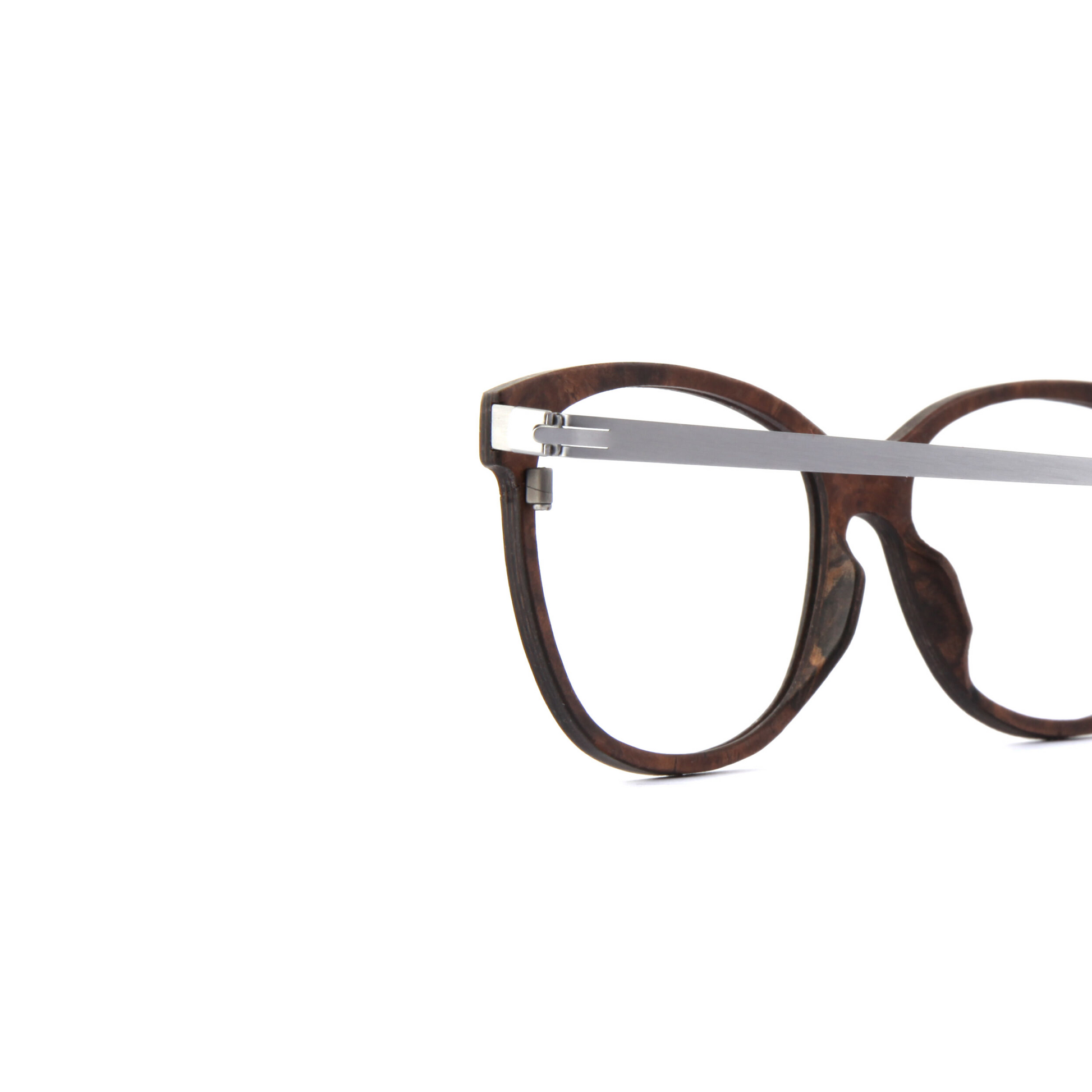 Gefertigt aus feinem Edelstahl, kombiniert mit edel gemasertem Holz, steht diese Fassung für die perfekte Balance zwischen Technik, Natur und zeitlosem Stil. Die klar definierte Form bleibt markant, während die filigranen Linien und das geringe Gewicht ein unvergleichlich angenehmes Tragegefühl schaffen.